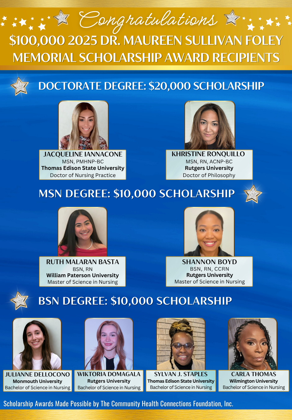 The $100,000 Dr. Maureen Sullivan Foley memorial Scholarship awards are made possible by the Community Health Connections Foundation (CHCF), Inc. and administered through the NJLN Scholarship Program.