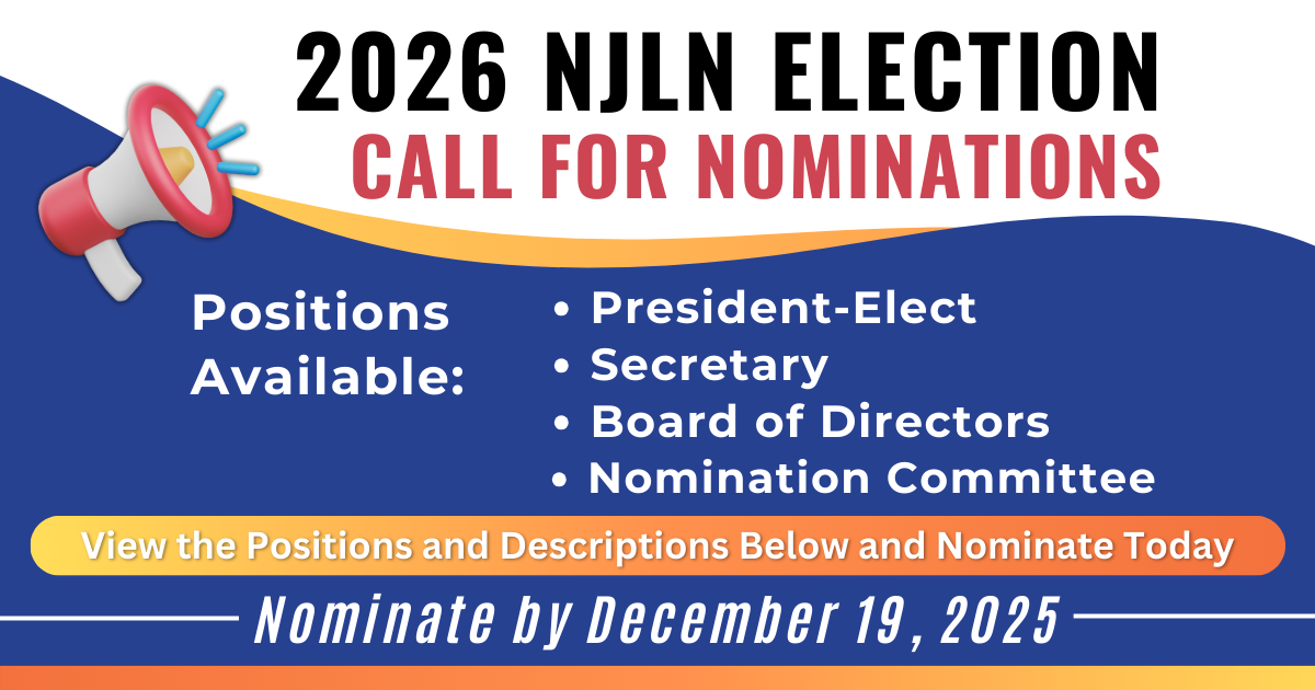 - The qualified slate of nominated candidates will be presented to the NJLN membership in good standing for the 2026 election. The election will be conducted through an electronic ballot where the results will be announced at the Annual NJLN Business Meeting on March 26, 2026, during the 2026 NJLN Convention at Harrah’s Resort in Atlantic City, New Jersey.