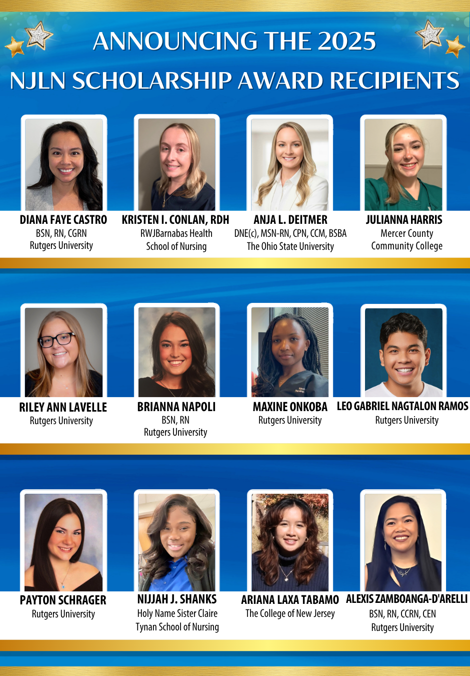 Below are the 2025 NJLN Scholarship Awards Each in the amount of $1,000 to be presented on November 7, 2025, during our 2025 NJLN Nurse Recognition and Scholarship Awards event at the Pines Manor.